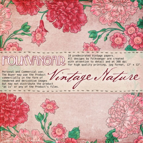 10 predecorated Vintage papers. All designs by Folkvangar are created with attention to detail and at 300 dpi for high quality printing, jpg format, 12" x 12".